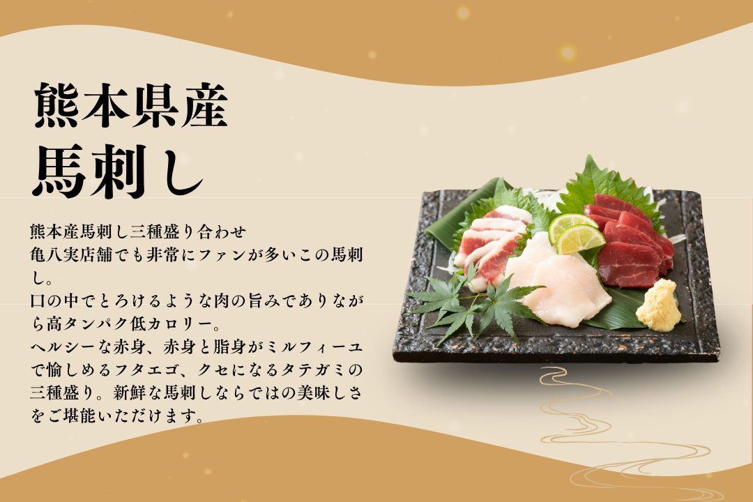 ・馬刺し(赤身15g ・特上フタエゴ15g ・タテガミ15g ・馬刺し用醤油)